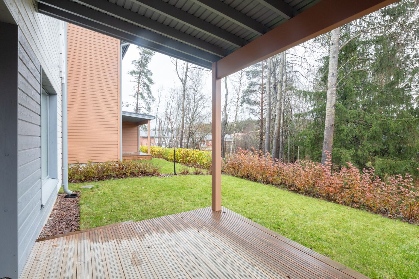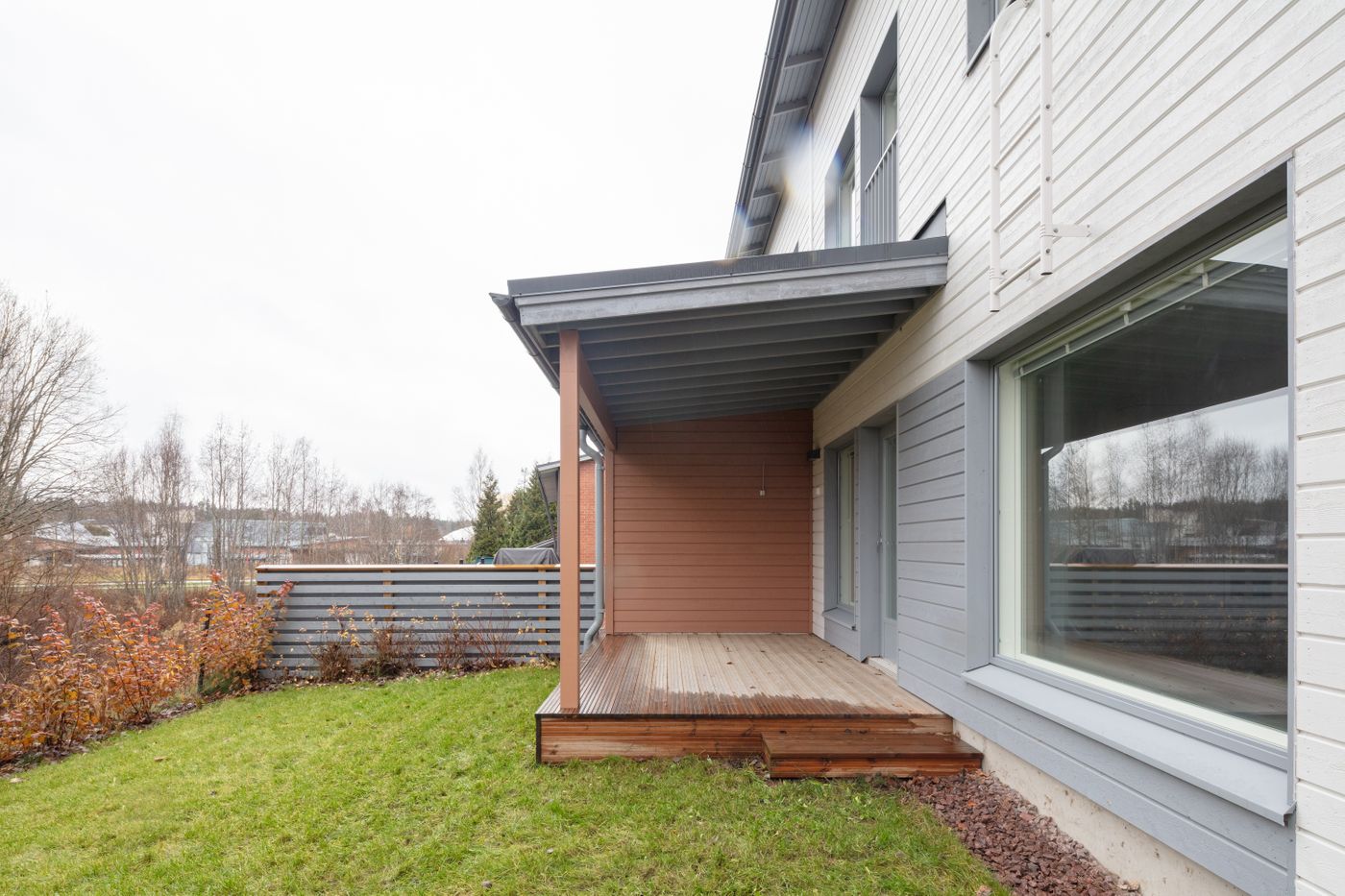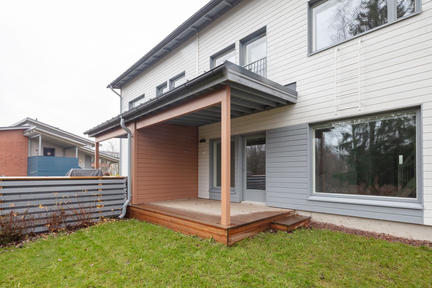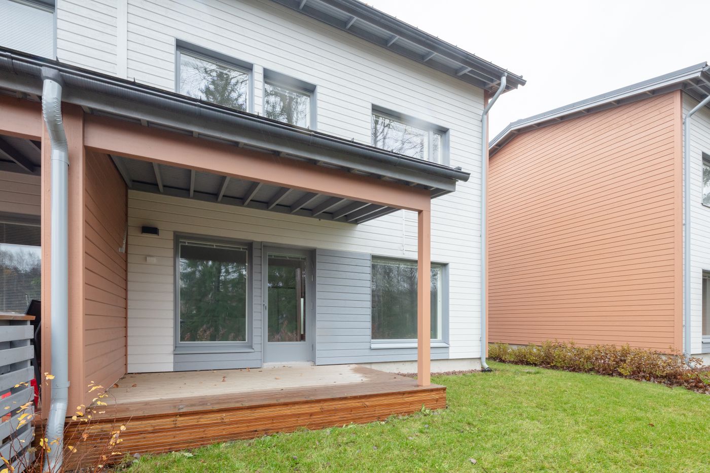 Kotoisa viiden huoneen paritalon puolikas, jossa on kaksi kylpyhuonetta, sauna ja terassi. Sisäänkäynnin yhteydessä on ulkovarasto. Heti eteisessä on tilava kaapisto sekä käynti alakerran kylpyhuoneeseen, jossa on pyykkikaappi, varaus pyykinpesukoneelle ja kuivausrummulle. Lisäksi kylpyhuoneen yhteydessä on sauna, jossa on moderni pyöreä kiuas.