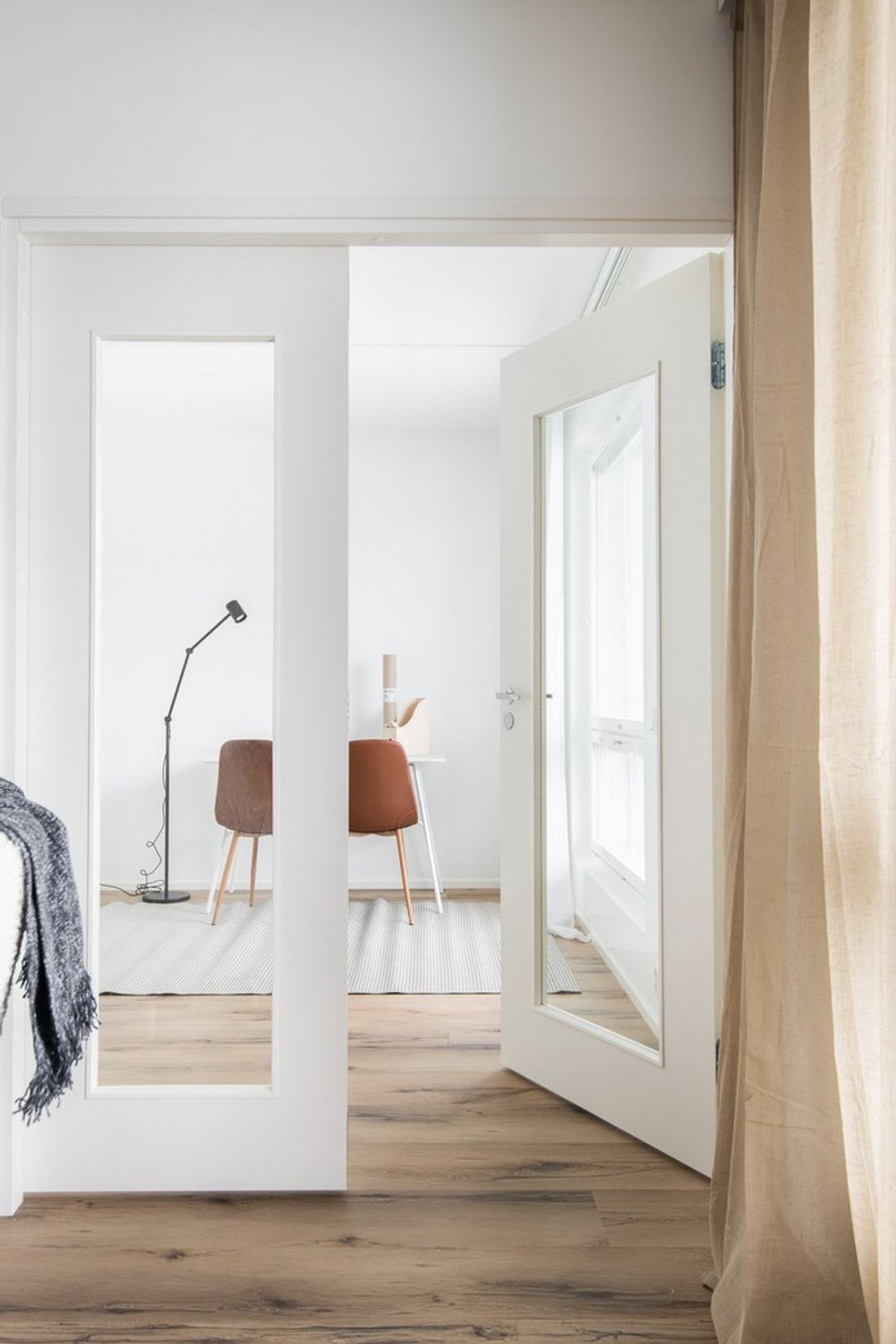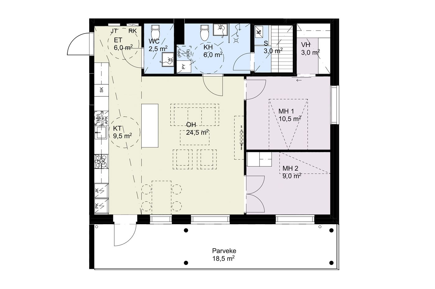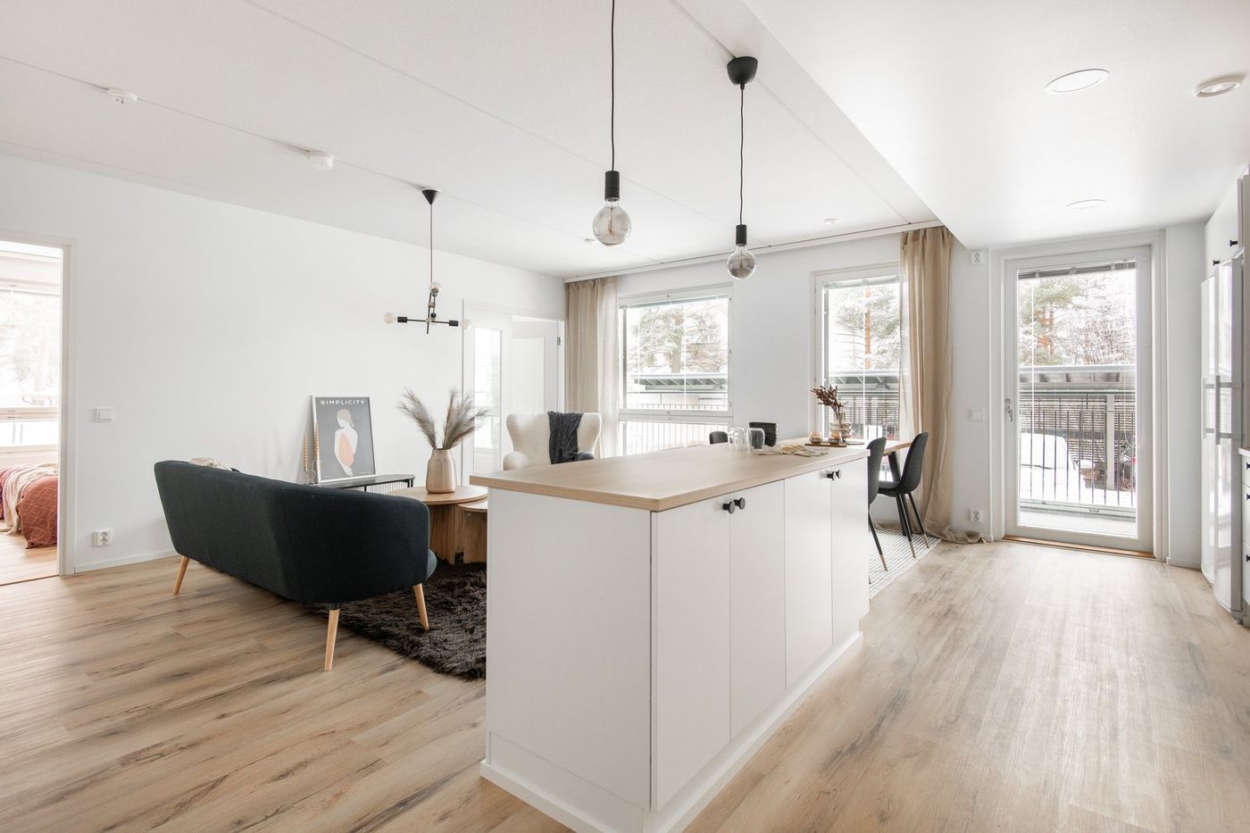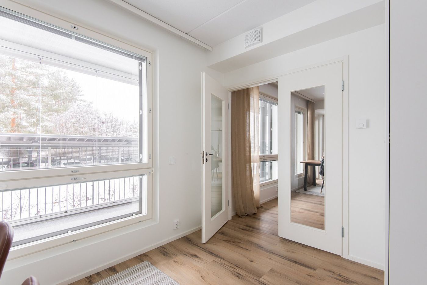 Olohuoneessa on hyvin tilaa oleskelu- ja ruokailuryhmälle. Olohuoneesta on käynti kodin isolle lasitetulle parvekkeelle sekä makuuhuoneisiin. Pienemmässä makuuhuoneessa on tanko- ja hyllykaapisto ja isommassa vaatehuone. Pienempään makuuhuoneeseen johtaa lasipariovet, jotka mahdollistavat tilan käytön osana olohuonetta.