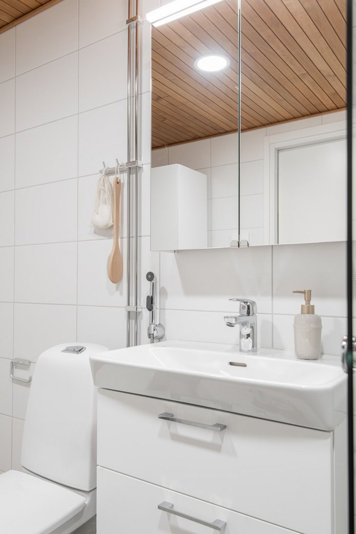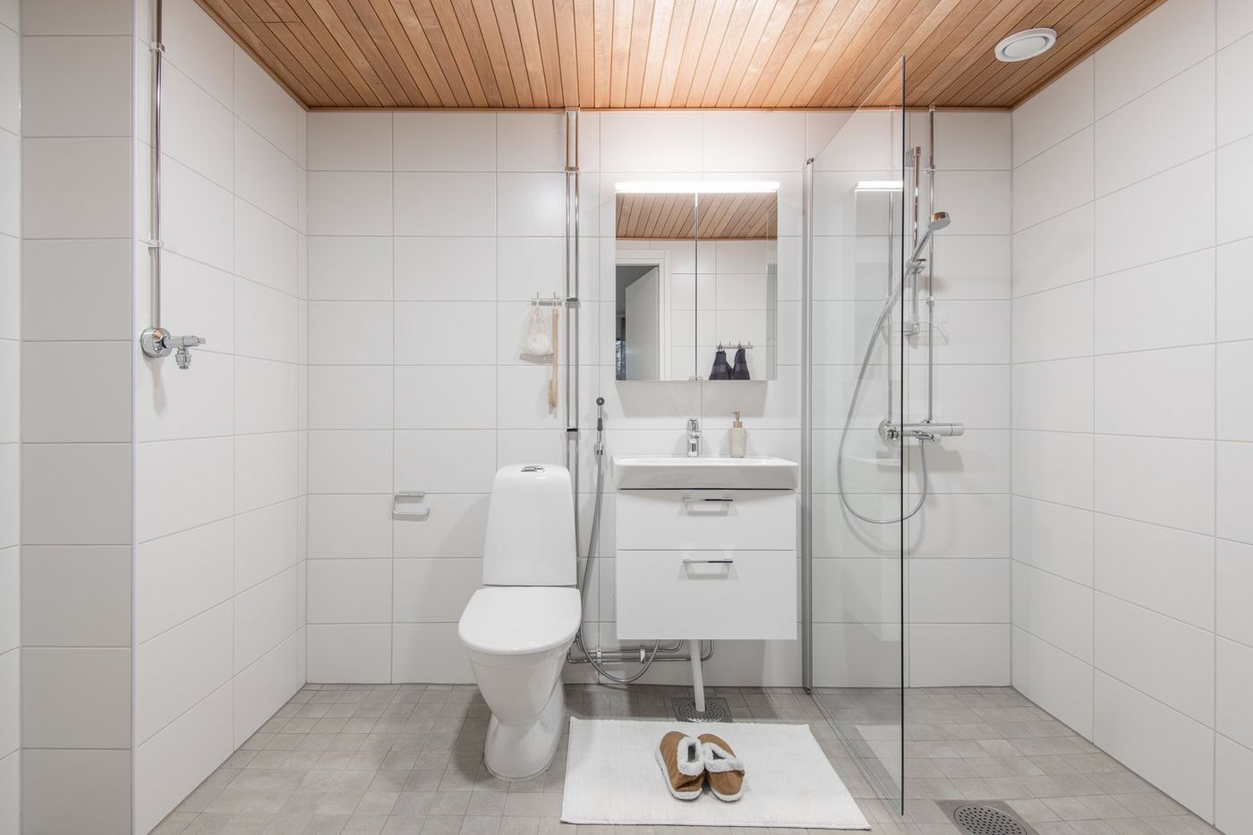 Kylpyhuone on laatoitettu. Pesualtaan yläpuolella peilikaappi ja alapuolella allaskaappi. Kylpyhuoneessa on kirkaslasinen kääntyvä suihkuseinä, pyyhekoukut ja wc-paperiteline. Kylpyhuoneessa on tilavaraus pyykinpesukoneelle ja kuivausrummulle sekä pyykkikaappi. Kylpyhuoneen katto on puupaneelia ja katossa on upotetut LED-valaisimet.