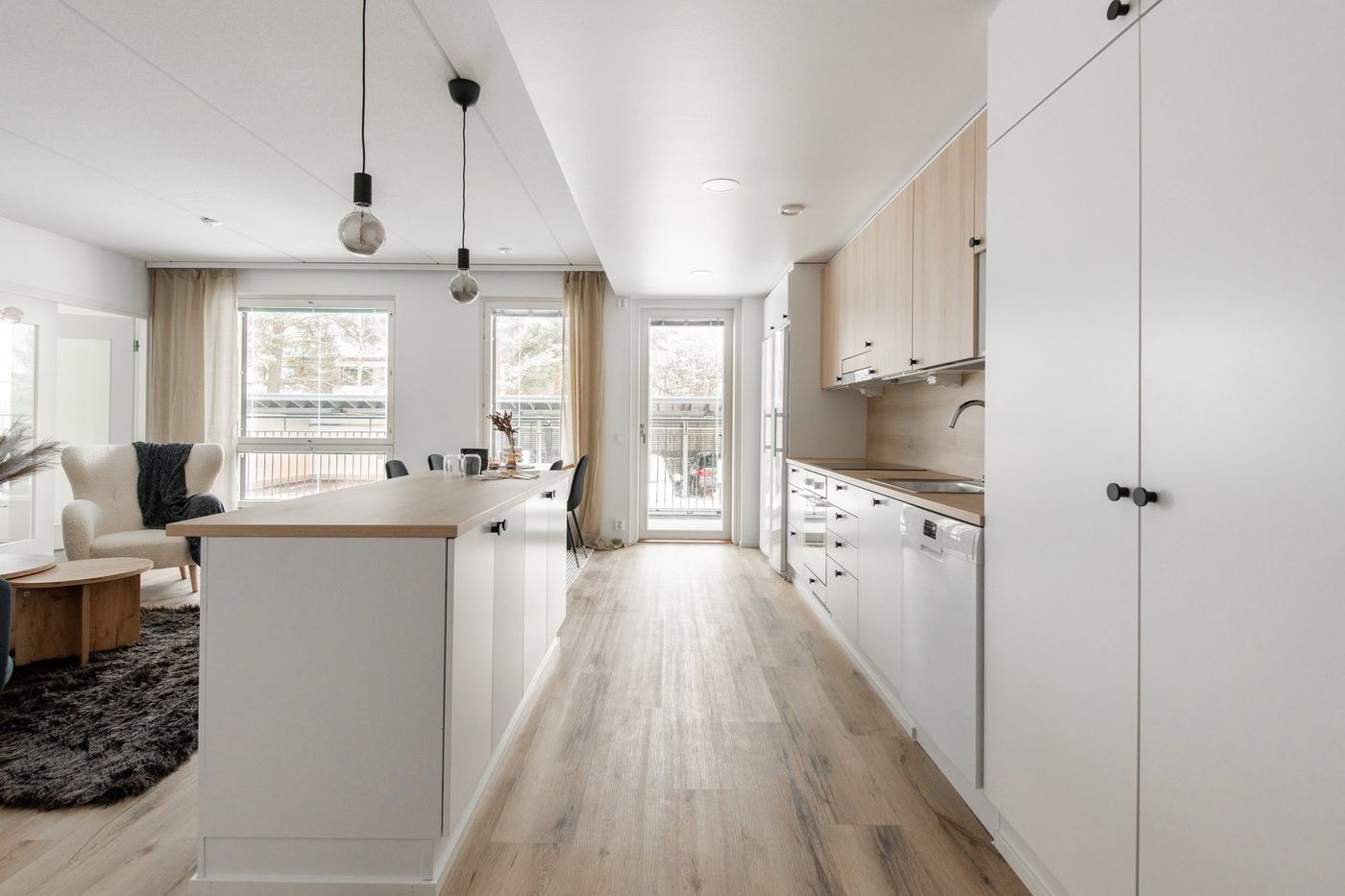 Tässä kolmen huoneen kodissa on hyvin tilaa ja ihana iso parveke. Eteisessä on tilavat kaapistot ja käynti kodin pienempään vessaan. Eteisestä aukeaa keittiön ja olohuoneen yhteinen tila. Keittiön toiminnot on sijoitettu yhdelle seinälle, ja tilaa jakaa saareke. Keittiössä on mm. astianpesukone ja täysikorkeat jääkaappi ja pakastin.