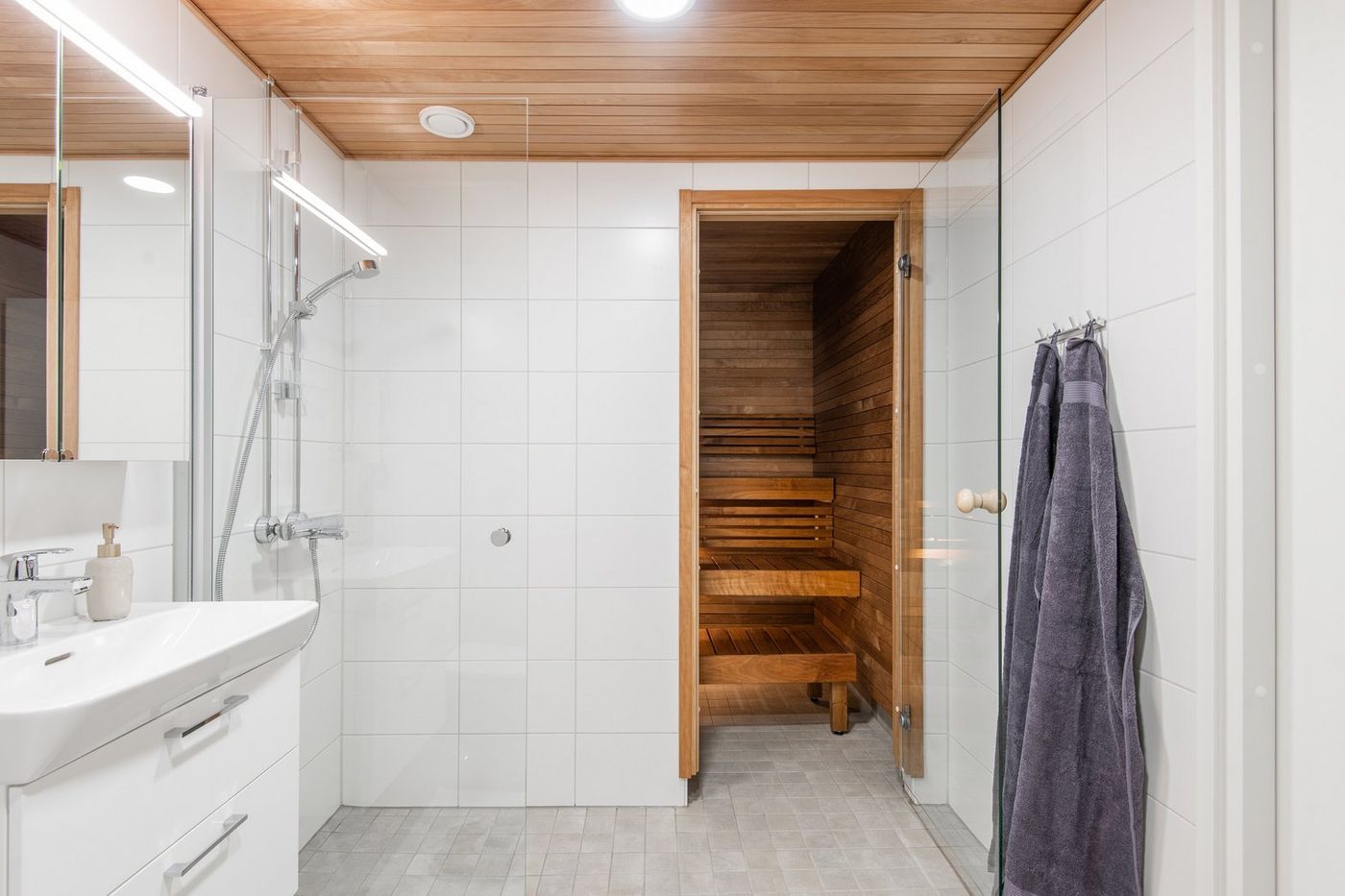 Kylpyhuoneessa on pyykkikaappi, varaus pyykinpesukoneelle ja kuivausrummulle sekä sauna. Nauti oman saunan löylyistä ja vilvoittele mukavasti parvekkeella.