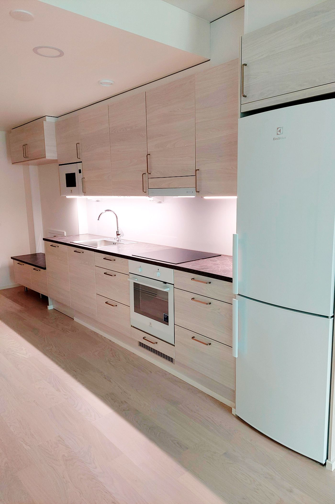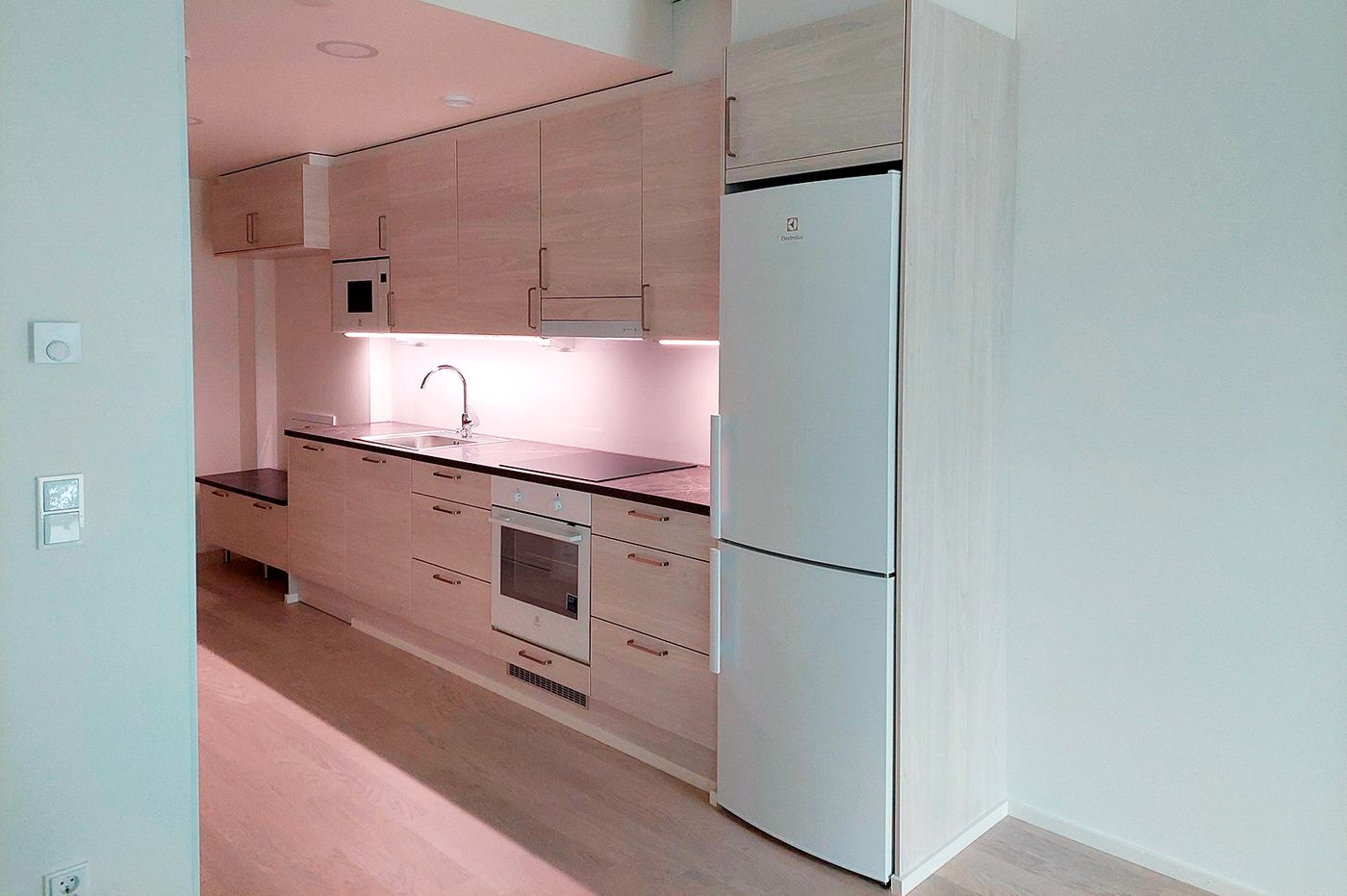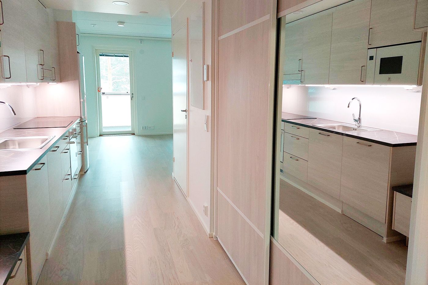 Kalusteovissa, työtasoissa ja kalusteiden välitilamateriaaleissa on materiaalit valittu. Kalusteuuni keraamisella keittotasolla, kalustepeitteinen astianpesukone, jääpakastinkaappi, integroitu mikro. Lattiapäällysteenä kestävä vinyyli.