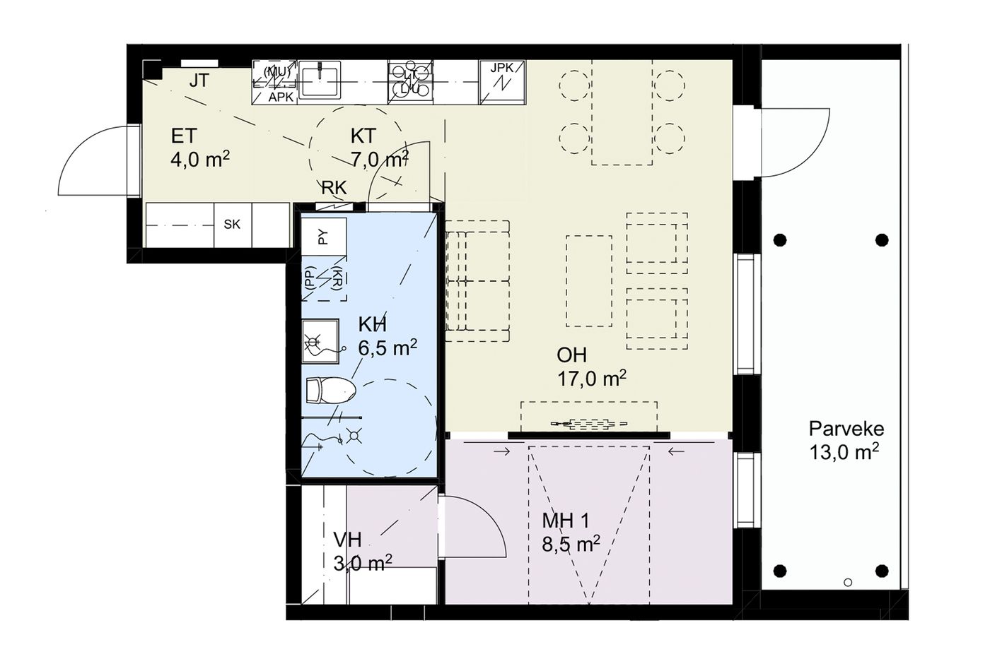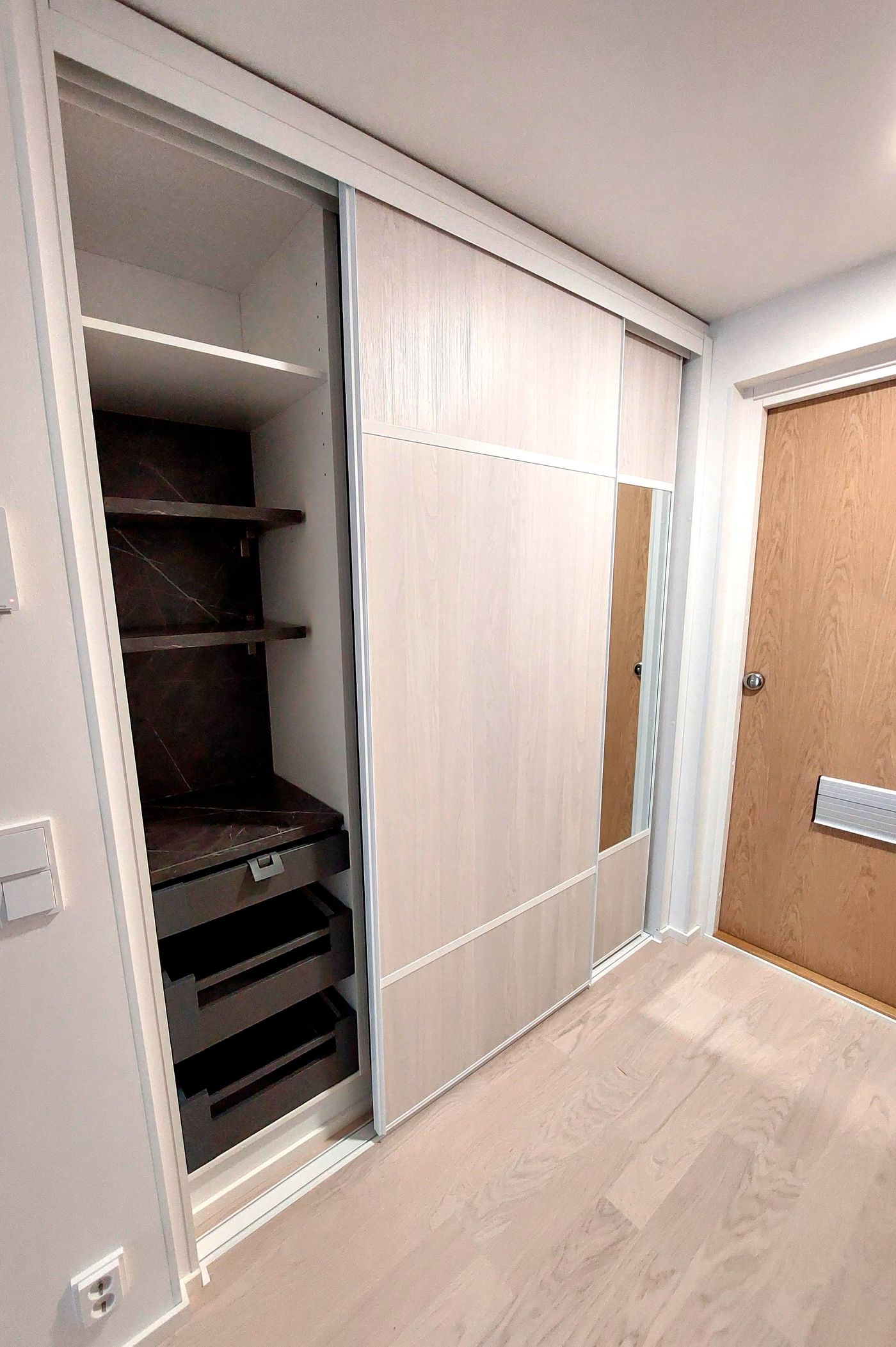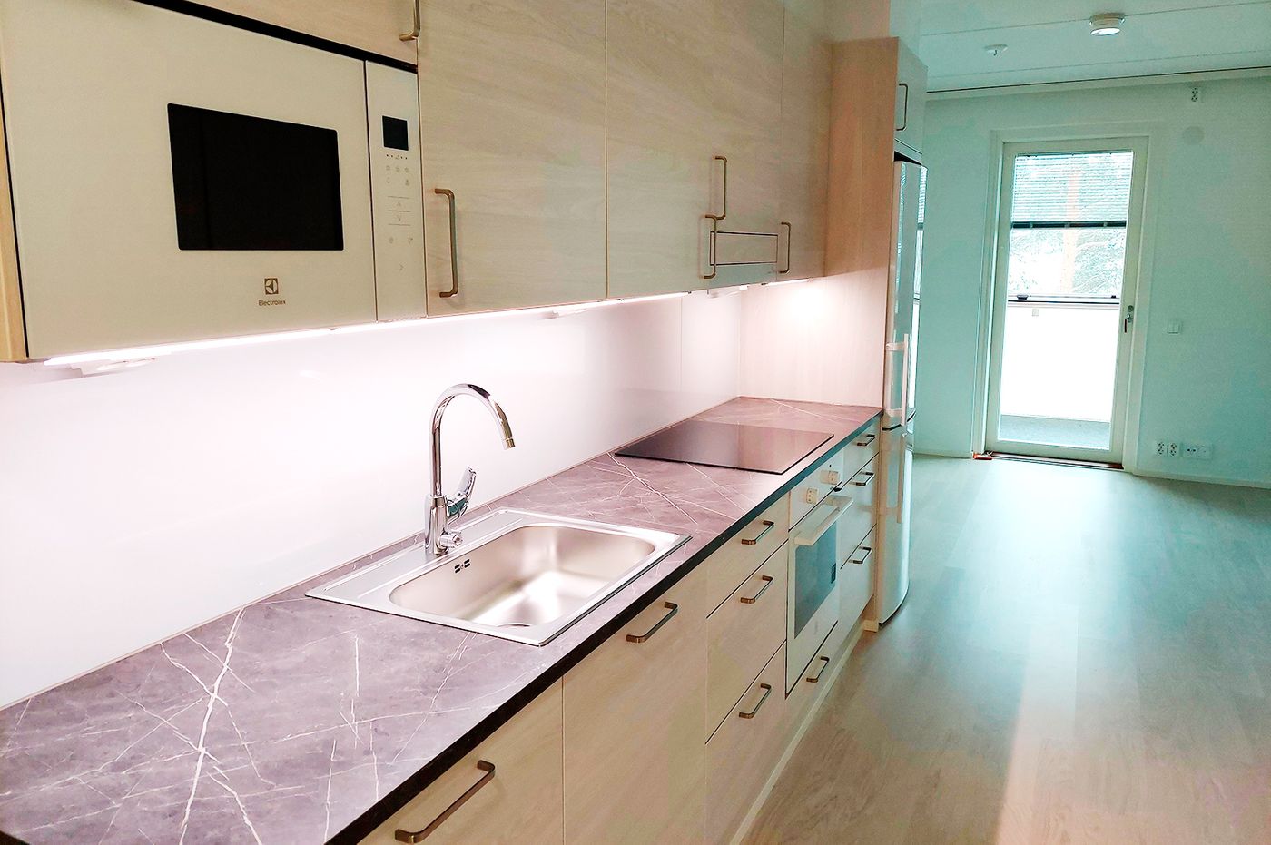 Kalusteovissa, työtasoissa ja kalusteiden välitilamateriaaleissa on materiaalit valittu. Kalusteuuni keraamisella keittotasolla, kalustepeitteinen astianpesukone, jääpakastinkaappi, integroitu mikro. Lattiapäällysteenä kestävä vinyyli.
