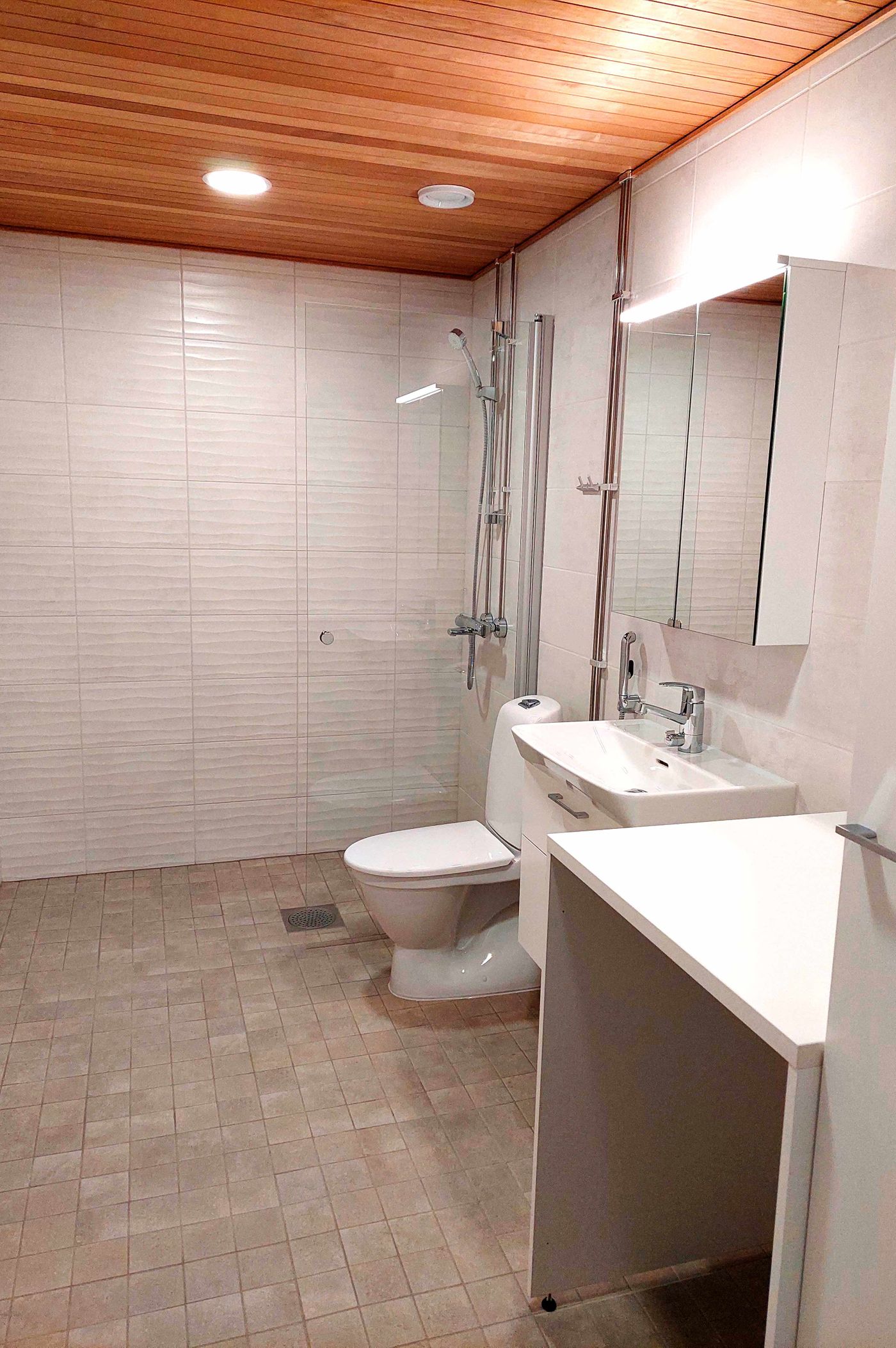 Kylpyhuone on laatoitettu. Seinä- ja lattialaatoissa on materiaalit valittu. Pesualtaan yläpuolelle asennetaan peilikaappi ja alapuolelle allaskaappi. Kylpyhuoneessa on kirkaslasinen kääntyvä suihkuseinä, pyyhekoukut ja wc-paperiteline. Kylpyhuoneessa on tilavaraus pyykinpesukoneelle ja kuivausrummulle sekä pyykkikaappi. Kylpyhuoneen katto on puupaneelia ja katossa on upotetut LED-valaisimet.