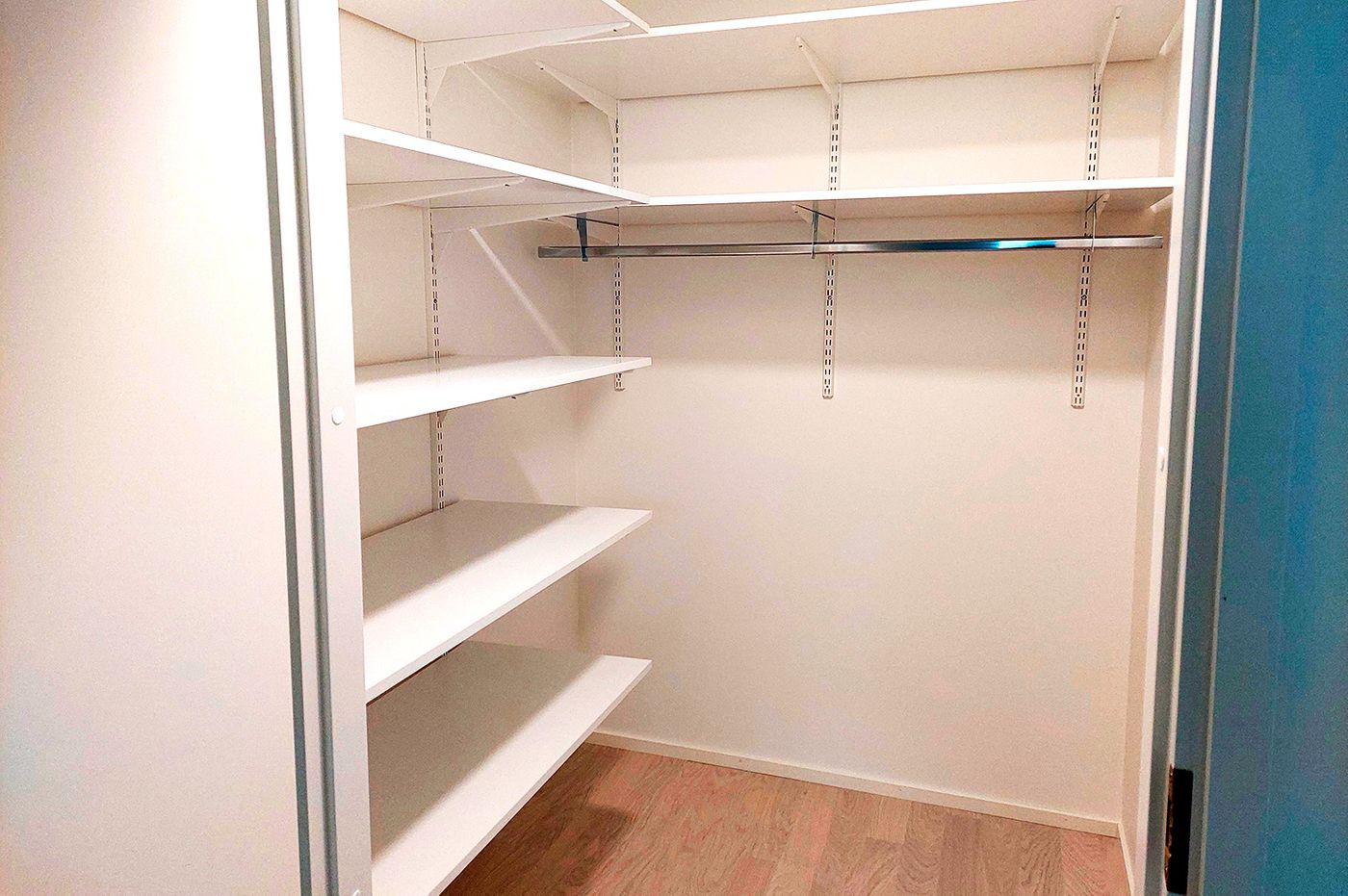 Makuuhuoneeseen on kaksi liukuovellista sisäänkäyntiä, jolloin hukkaneliöitä ei ole yhtään ja tilaa on jopa 160 cm leveälle parisängylle. Makuuhuoneessa on reilut säilytystilat tilavassa vaatehuoneessa. Kylpyhuoneessa on pyykkikaappi, varaus pyykinpesukoneelle ja kuivausrummulle sekä tilaa esimerkiksi pystymalliselle kuivaustelineelle tai vaikkapa hyllykölle.