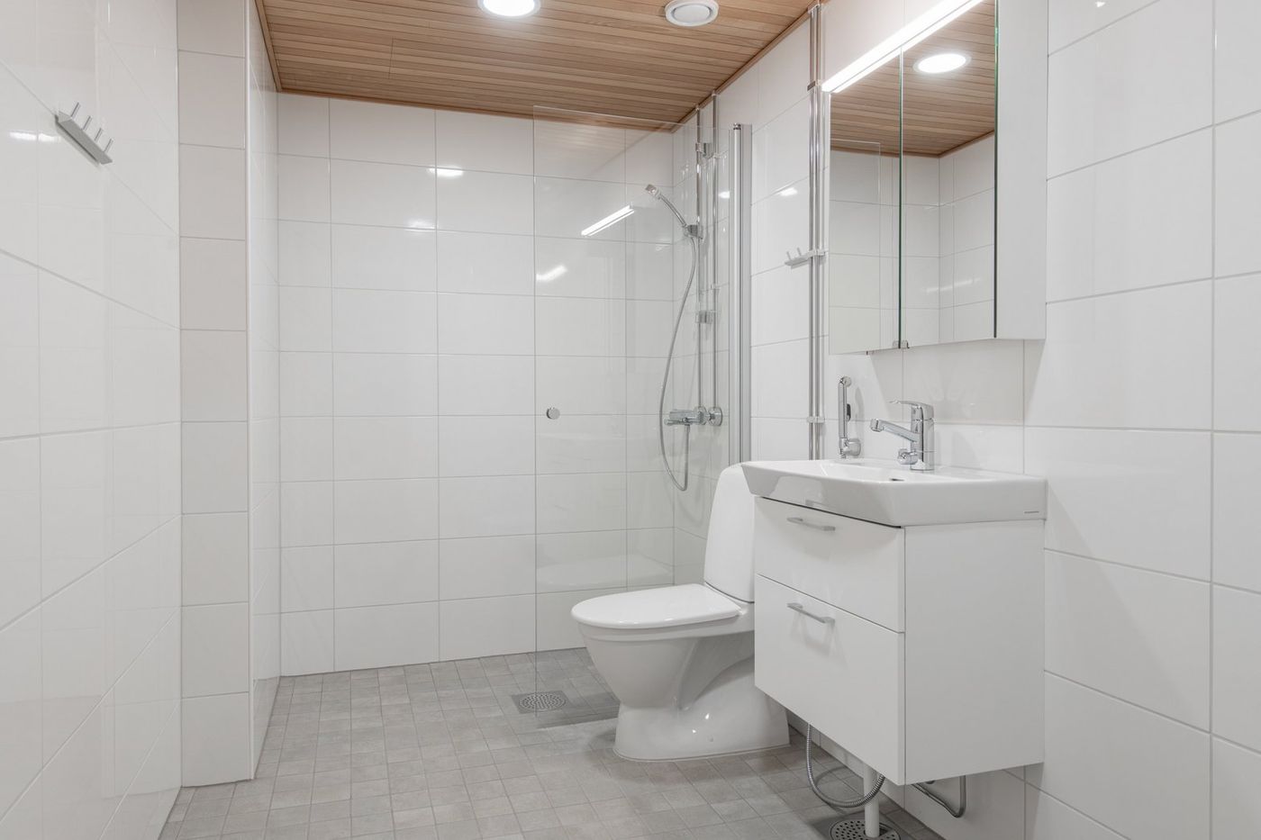 Kylpyhuone on laatoitettu. Pesualtaan yläpuolella peilikaappi ja alapuolella allaskaappi. Kylpyhuoneessa on kirkaslasinen kääntyvä suihkuseinä, pyyhekoukut ja wc-paperiteline. Kylpyhuoneessa on tilavaraus pyykinpesukoneelle ja kuivausrummulle sekä pyykkikaappi. Kylpyhuoneen katto on puupaneelia ja katossa on upotetut LED-valaisimet.