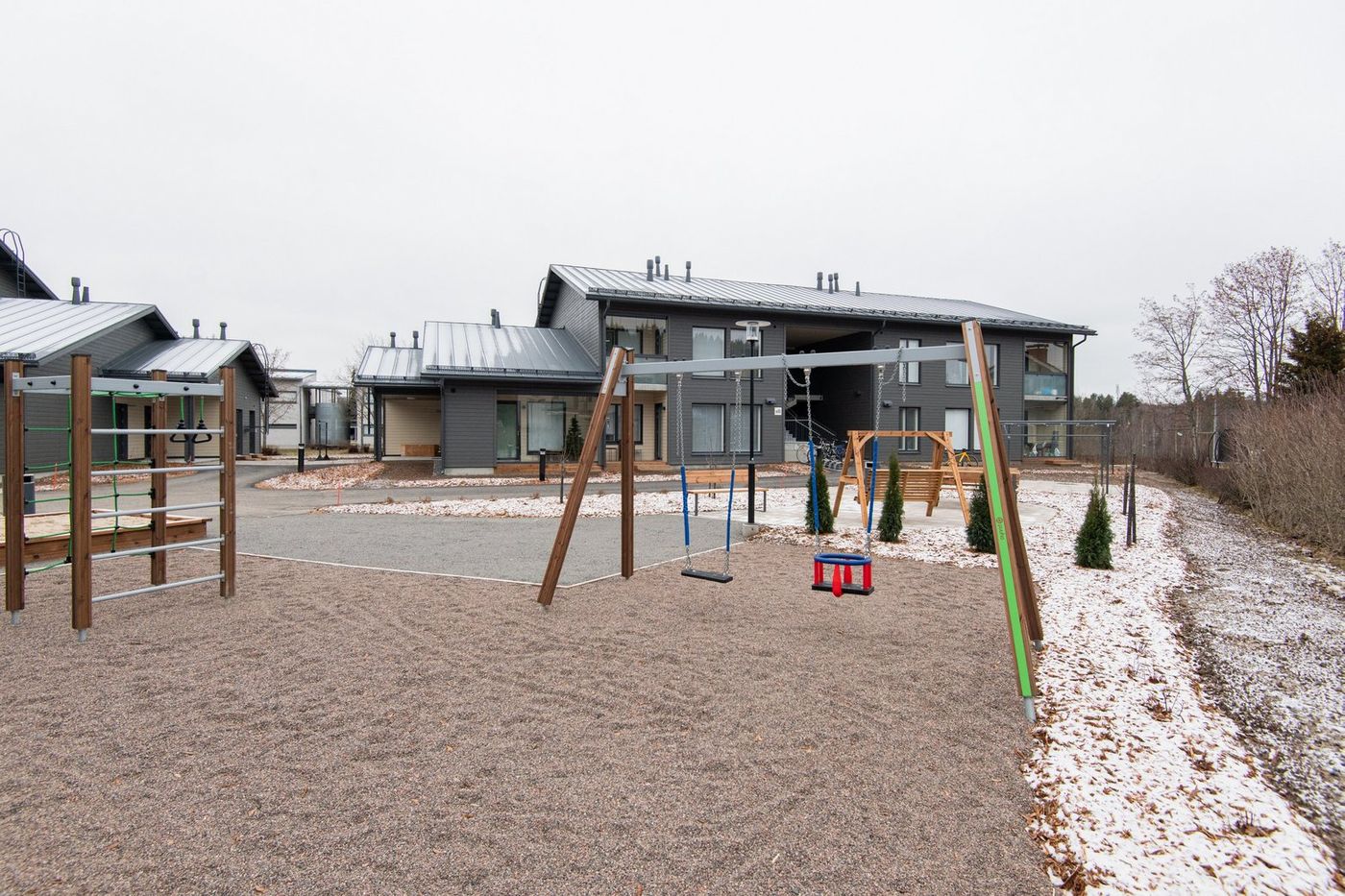 Jyväskylän Ristonmaa koostuu kolmesta kaksikerroksesta pienkerrostalosta, joissa on koteja aina yksiöistä neljän huoneen asuntoihin. Vapaana on enää yksi kaksio > Kodeissa on laadukkaat pintamateriaalit ja kodinkoneet, lattiat ovat kestävää vinyyliä. Kolmen talon keskellä on asukkaiden yhteinen piha, jossa on viihtyisä leikki- ja oleskelualue.