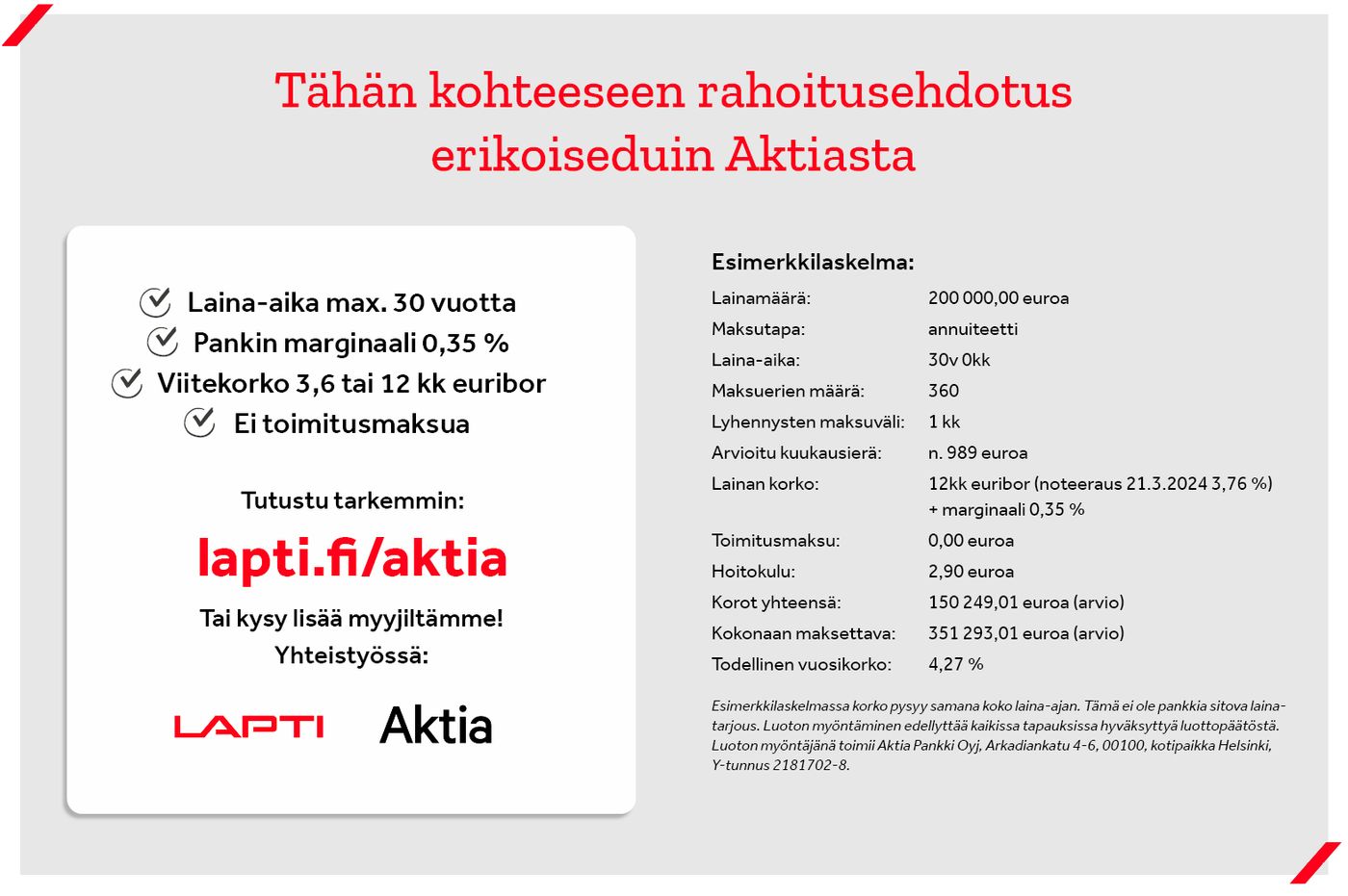 Ilmoitetut rahoitusvastikkeet on tarkistettu 5,2 % kokonaiskorolla. Koron tarkistuspäivä on vuosittain lokakuussa, jolloin lainan todellinen kokonaiskorko määräytyy viitekoron korkonoteerauksen mukaan lisättynä marginaalilla. Yhtiölaina on sidottu 12 kk Euribor-viitekorkoon + marginaali 0,95 %. Valmistumisen jälkeen 2 ensimmäistä asumisvuotta on lyhennysvapaata, jolloin rahoitusvastikkeella katetaan vain lainan korko. Rahoitusvastiketta, jolla katetaan lainan korko ja lyhennys, aletaan periä noin puoli vuotta ennen ensimmäistä lainanlyhennystä, joka on arviolta syksyllä 2025. Laina lyhenee tasalyhennyksin 23 vuoden ajan.